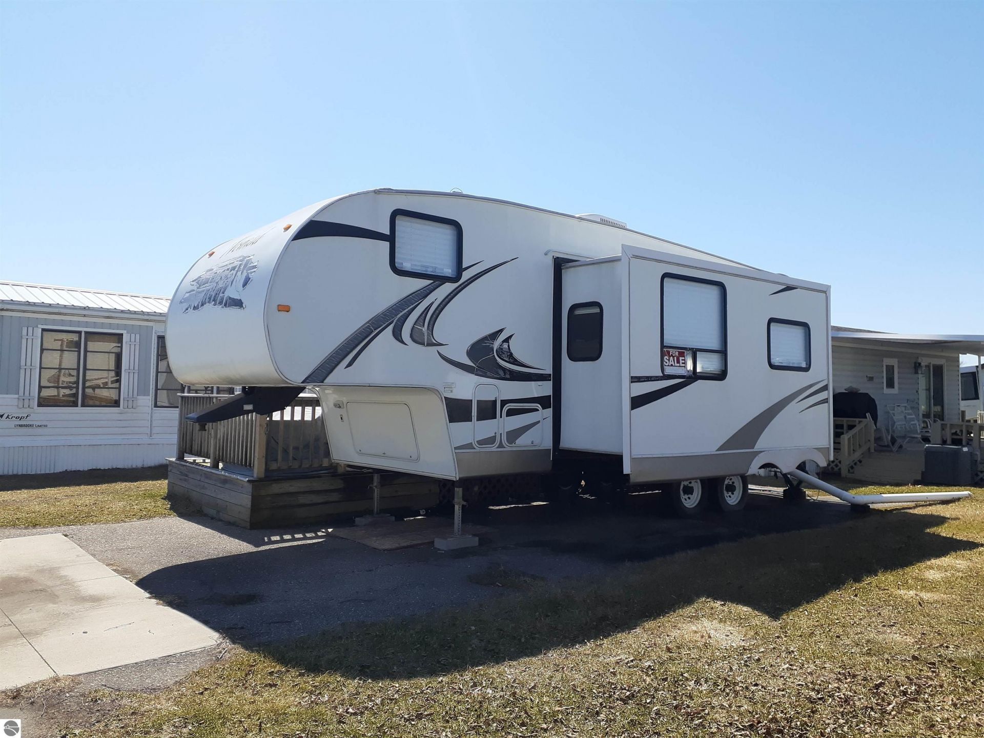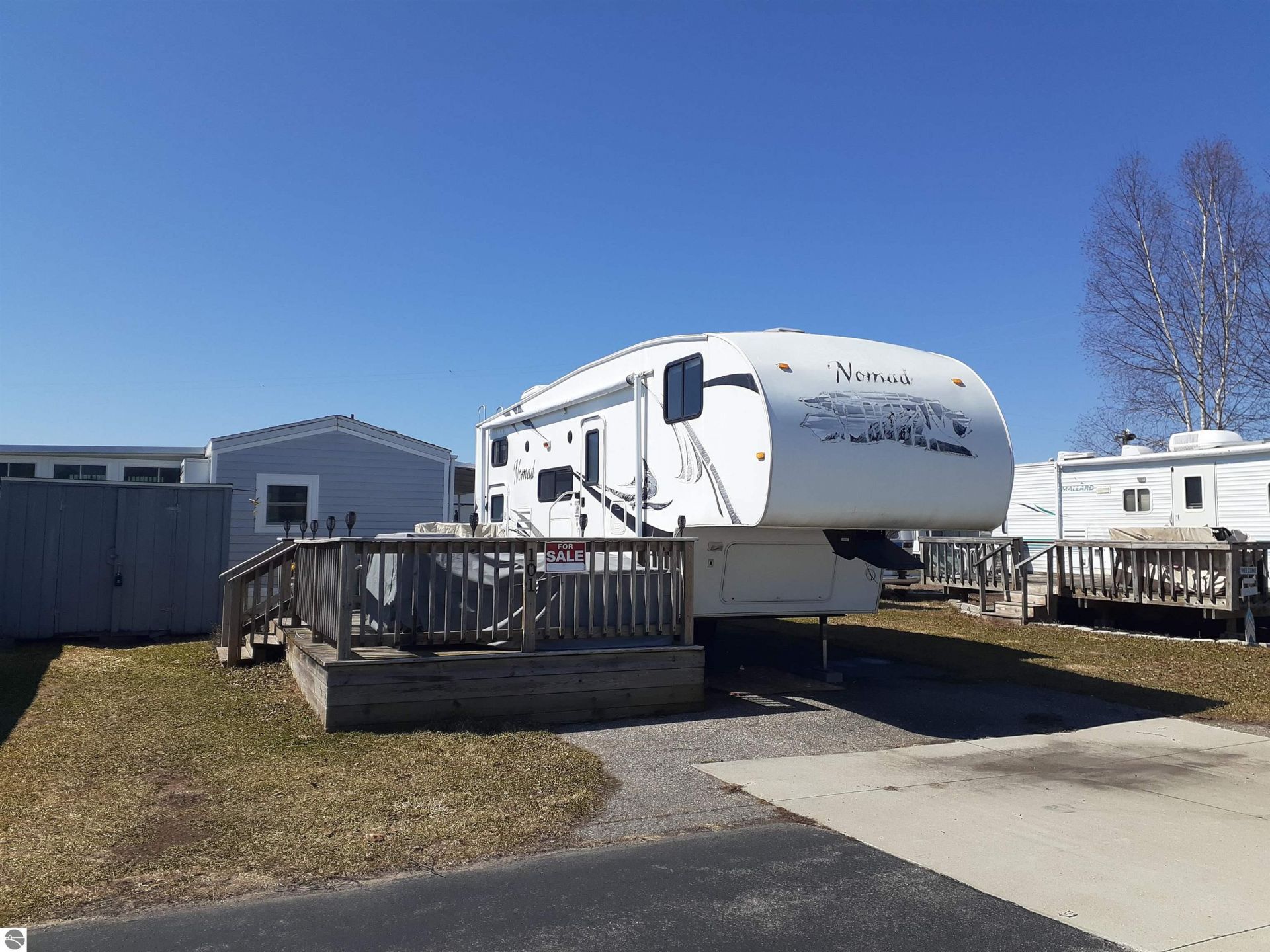 Up North Summer Retreat! Discover your perfect summer getaway at the AuSable Huron Condominium Campground, which offers breathtaking views of Lake Huron's sugar sand beach, the AuSable River, and Marina. Lot #101 comes with a 2010 28ft Skyline Nomad 5th Wheel with a new tankless water heater, kitchen sink, and fireplace. Large shed for extra storage. The Private Deck: Offers generous outdoor space overlooking the marina and lake with super cool outdoor lighting and an outdoor fireplace. Quarterly dues of $281 cover numerous amenities: clubhouse, 2 sets of modern renovated bathrooms, a fish cleaning station, and a private boat launch for residents only, a pavilion shared between the campground and marina, and an amazing beachfront., This camper comes fully furnished. All you need to bring are your clothes, flip-flops, and fishing poles to enjoy the perfect summer getaway! Boatslip is not included in the sale but you can purchase or rent one more info can be obtained from the AuSable Huron Camground Condo Marina