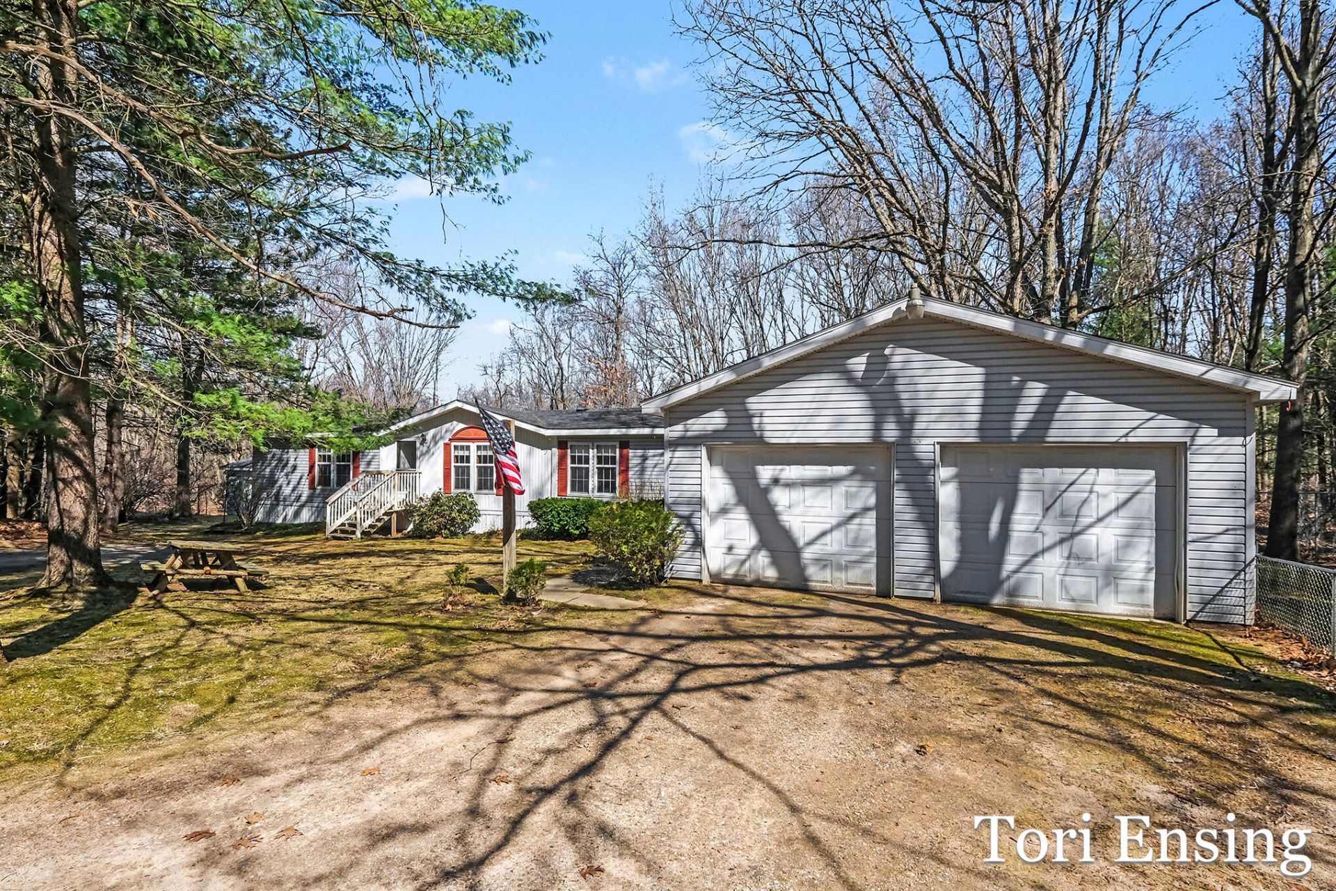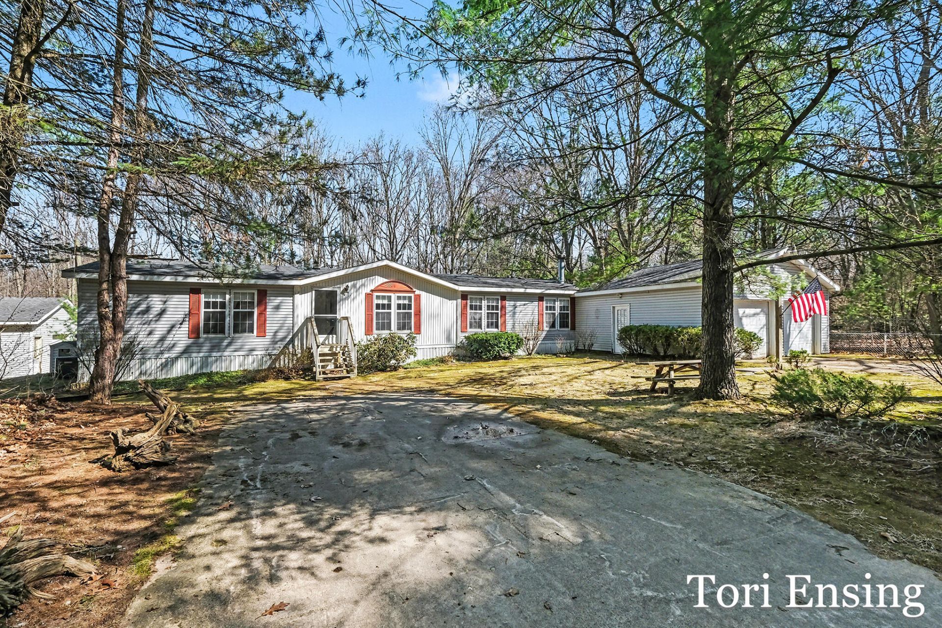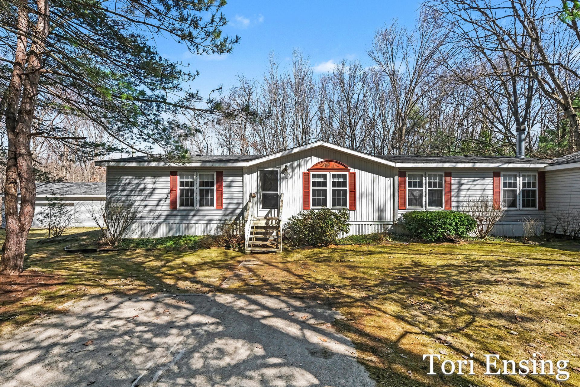 Large manufactured ranch style home nestled on 1.25 acres. Main floor offers family room, with a separate formal dining area and a living room with fireplace. Good sized kitchen with ample cabinets. Appliances to stay with the home. Large primary bedroom with a large walk-in-closet and over sized full bathroom. 2 additional bedrooms & another full bathroom. Main level laundry. 3-seasons room off the back that is perfect for entertaining. Outside you will find a peaceful, fully fenced in, wooded yard with great privacy. 2-stall attached garage and nice pole barn with cement floor. A small creek runs through the property on the west side of the yard. A/C and Natural Gas. Schedule your private showing today!