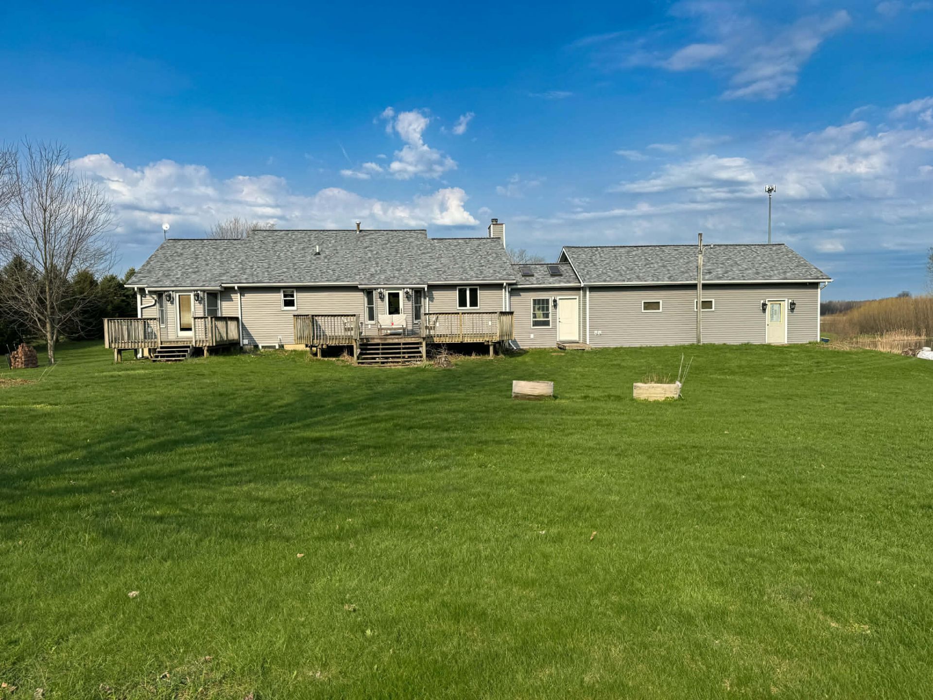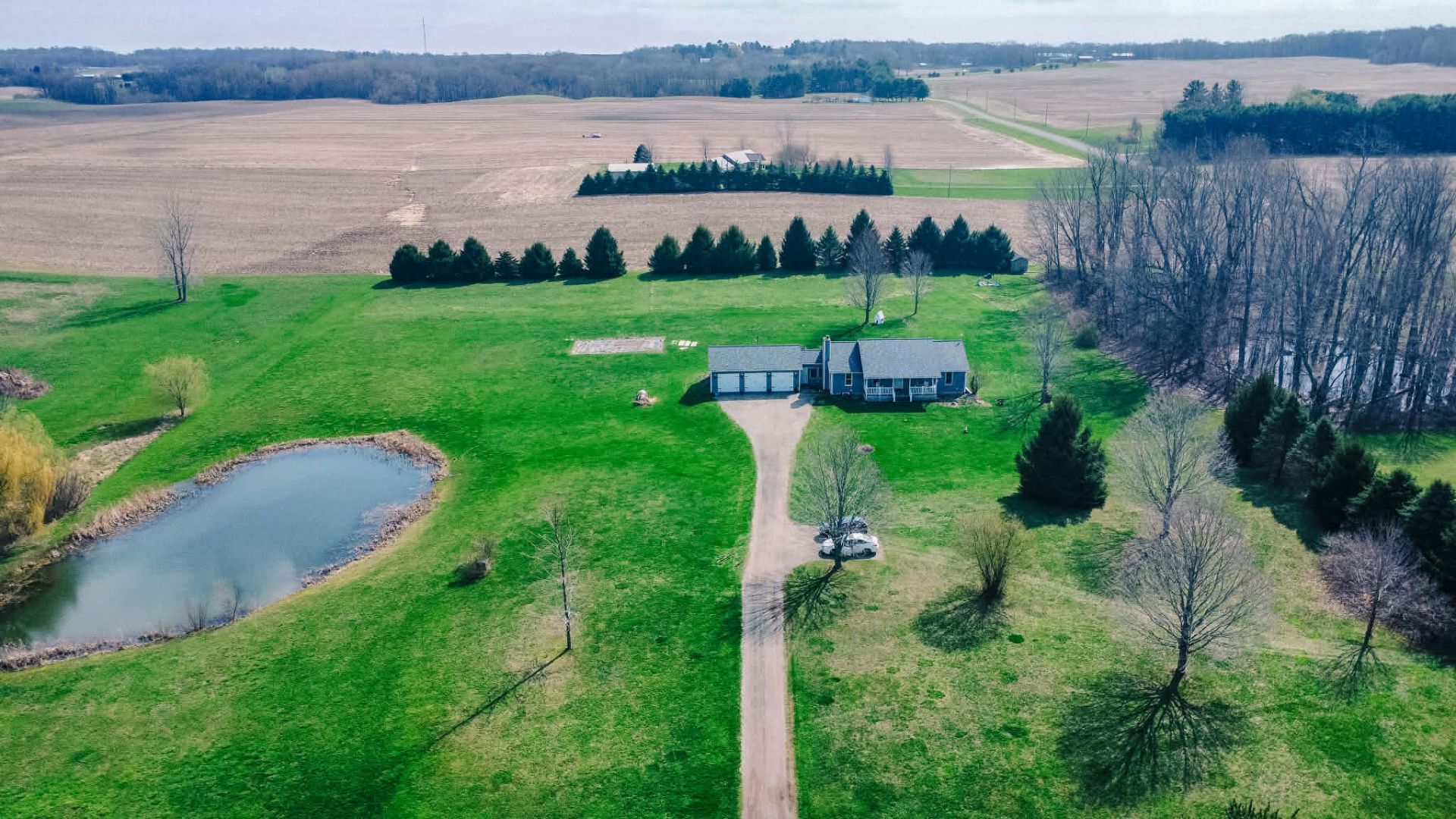 Discover your private 5.5-acre retreat in this move-in-ready ranch that seamlessly blends modern, high-end design with the peacefulness of the countryside. The main living space makes a striking first impression with its high ceilings and a floor-to-ceiling stone fireplace, all bathed in natural light that accentuates the clean, crisp finishes and rich hardwood floors. Beyond the interior, the sprawling grounds feature a tranquil private pond and exceptional outdoor living spaces, including a dedicated deck off the primary suite for a secluded start to your day. The finished lower level is thoughtfully designed as a complete mother-in-law suite, offering a secondary living room and kitchen hookups to provide total independence and comfort for guests. Finished with an oversized three-car attached garage and professional upgrades throughout, this property delivers a perfect balance of luxury, privacy, and versatile living.