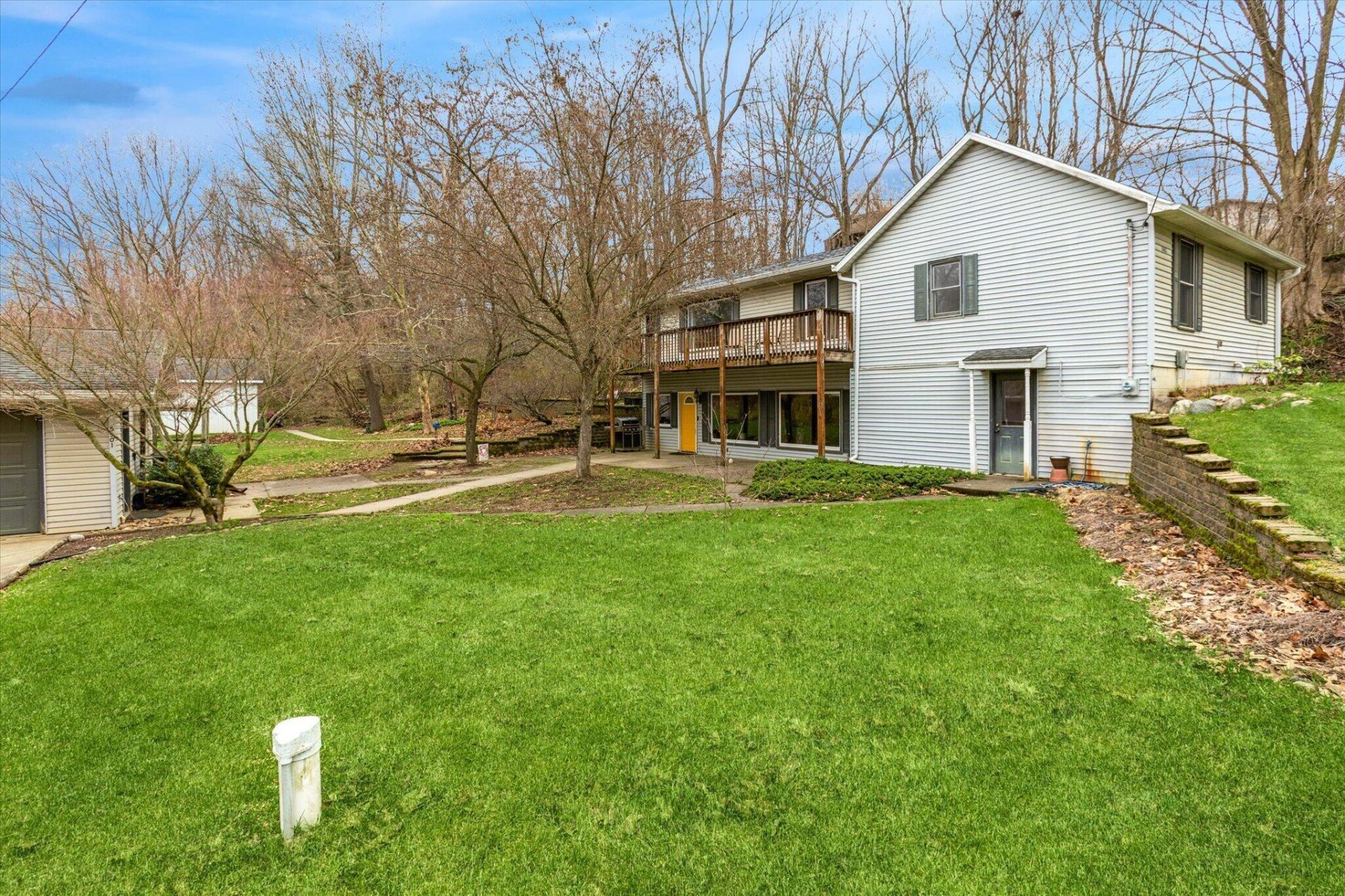 Welcome to 5901 Carmody Rd. Situated on 7.67 acres, the property is wooded with maintained trails that make it easy to enjoy the land. The patio deck offers the perfect spot to relax or entertain, with plenty of room for outdoor dining and gatherings. Additional seating areas throughout the property create peaceful spaces to unwind. Step into a home that combines space, natural light, and a functional layout. Large windows bring in consistent morning and afternoon light, brightening the main living areas. The home features spacious bedrooms and a large garage, offering flexibility for storage, hobbies, or multiple vehicles. The walkout basement provides additional living space with durable stone tile flooring throughout, along with a recreation room that includes a fireplace. Bathrooms are finished with ceramic tile, adding a clean and practical finish. A large main-floor deck extends the living space outdoors, creating an easy transition for gatherings or quiet time outside. A spacious pole barn provides ample room for storage, equipment, or workshop use. Several key updates have already been completed, including a new roof (1 year old), newer HVAC system and well (1-2 years old), and a drain field less than 5 years old. Additional improvements include a new water heater, water pressure tank, water softener, utility sink, and added attic insulation. This is a great combination of acreage and updates in a desirable Coloma location.