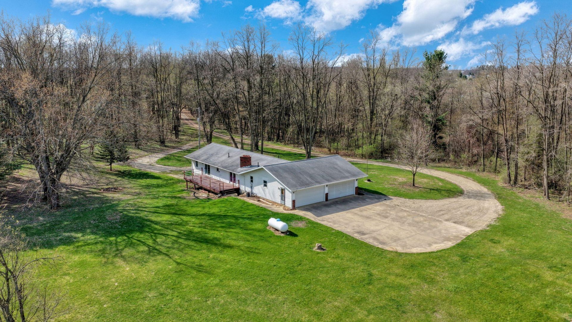 Tucked away at the end of a long, wooded drive, this private 16-acre estate offers a rare opportunity to create something truly exceptional. Surrounded by mature trees and open pasture, the setting delivers a sense of seclusion and natural beauty that is increasingly hard to find. The residence features 3 bedrooms and 3 full bathrooms, with a spacious layout ready to be reimagined. Two fireplaces add warmth and character, while the walk-out lower level--partially finished and complete with a wet bar--offers additional space for entertaining or extended living.Outdoor living is highlighted by a composite deck overlooking the property, providing a peaceful vantage point to take in the surrounding landscape. A substantial 4.5-car garage offers ample room for vehicles, storage, or workshop use.Equestrian and hobby farm enthusiasts will appreciate the impressive Morton barn with 8 stalls, complemented by open pasture space ideal for a variety of uses. The infrastructure is in place--now ready to be elevated to its full potential.This is a rare opportunity to invest in acreage, privacy, and possibility. With thoughtful updates and vision, this property could be transformed into a remarkable country estate.